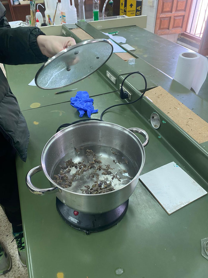 A lo largo de la sesión, los estudiantes han trabajado con material vegetal, preparando la lavanda y llevándola a un proceso de destilación mediante vapor de agua 💧🔥. Durante la práctica, han podido observar cómo el vapor arrastra los compuestos aromáticos de la planta, dando lugar al hidrolato, un producto natural con múltiples aplicaciones.