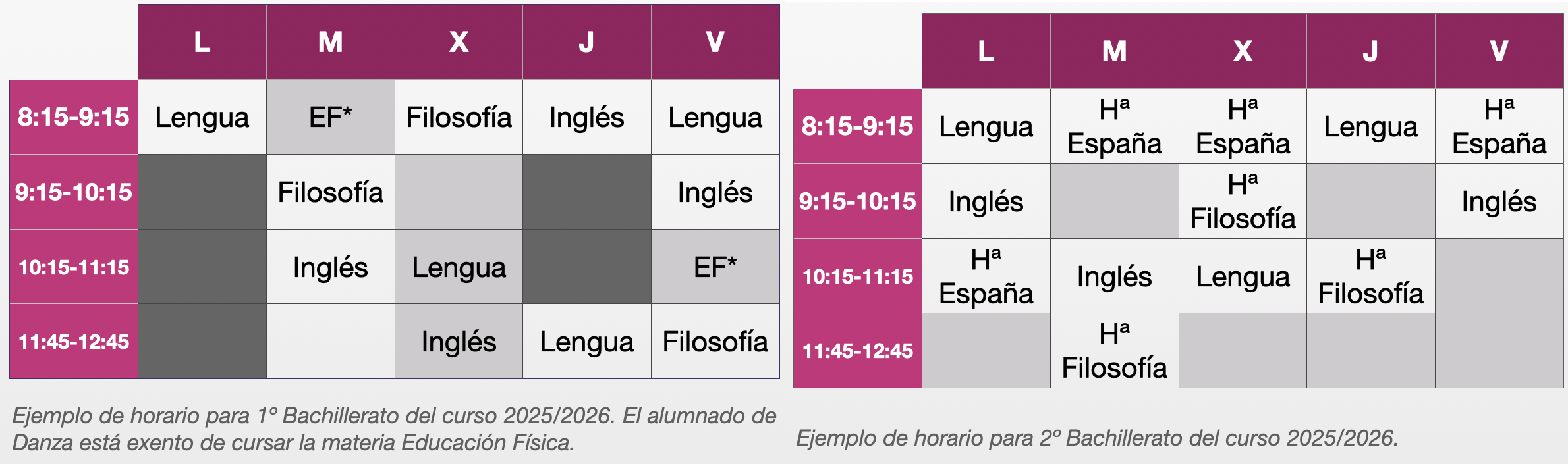 A modo de ejemplo, se facilitan algunos horarios para los cursos 1º y 2º Bachillerato de cursos anteriores. Se hace constar que estas distribuciones son meramente informativas y, por tanto, no han de generar expectativas. Solo se intentará garantizar la distribución de clases en las tres primeras franjas horarias (de 8:15 a 11:15).