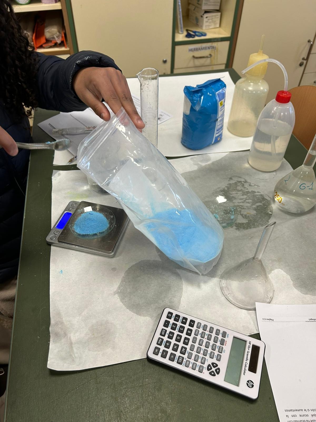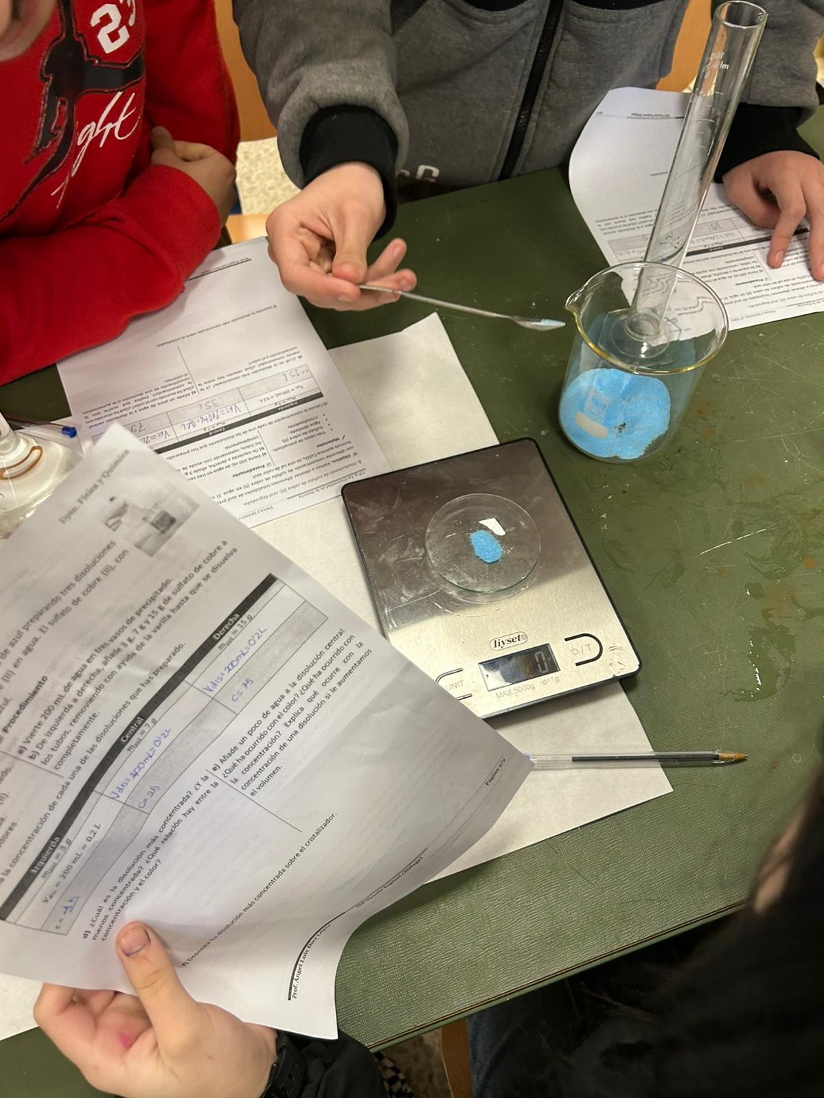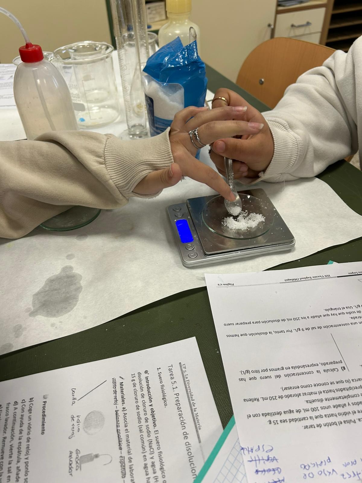 Durante la sesión, los estudiantes prepararon suero fisiológico (disolución de cloruro de sodio al 0,9%), similar al que se utiliza en aplicaciones médicas, y elaboraron también disoluciones de sulfato de cobre (CuSO₄) con diferentes concentraciones, observando cómo varía la intensidad del color en función de la cantidad de soluto disuelto.