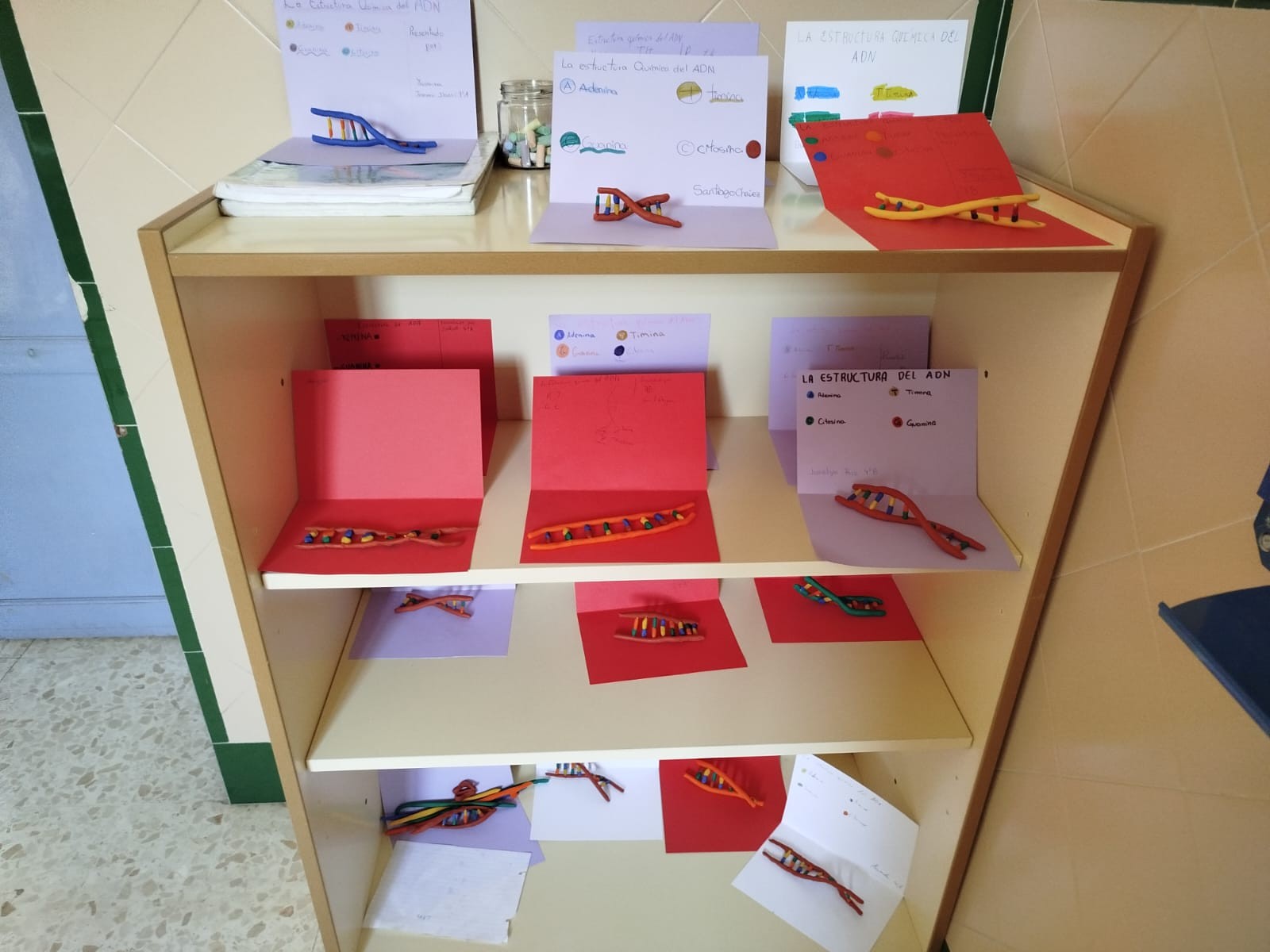 Esta actividad ha permitido integrar conocimientos de biología molecular, química y metodología científica, además de fomentar competencias como el trabajo cooperativo, la comunicación científica y la representación espacial de estructuras complejas. Los resultados fueron expuestos en el aula de ciencias, donde el alumnado explicó los principios del código genético y su importancia en los procesos de replicación y transmisión hereditaria.