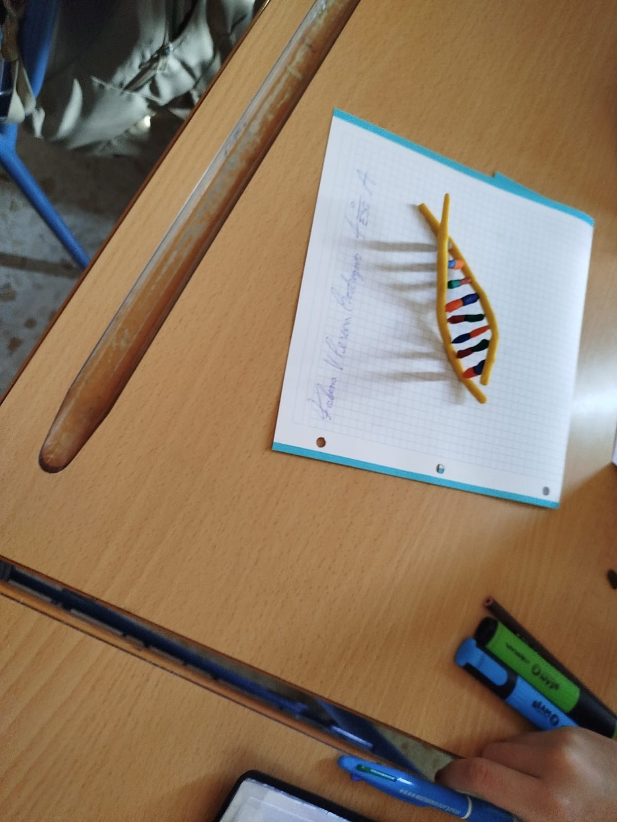 Durante varias sesiones, el alumnado trabajó en equipos diseñando y elaborando modelos tridimensionales de la doble hélice, representando con precisión los nucleótidos, las bases nitrogenadas y las uniones entre cadenas complementarias. Para ello, emplearon materiales diversos —como goma EVA, alambre, plastilina o impresiones 3D—, combinando creatividad y rigor científico.
